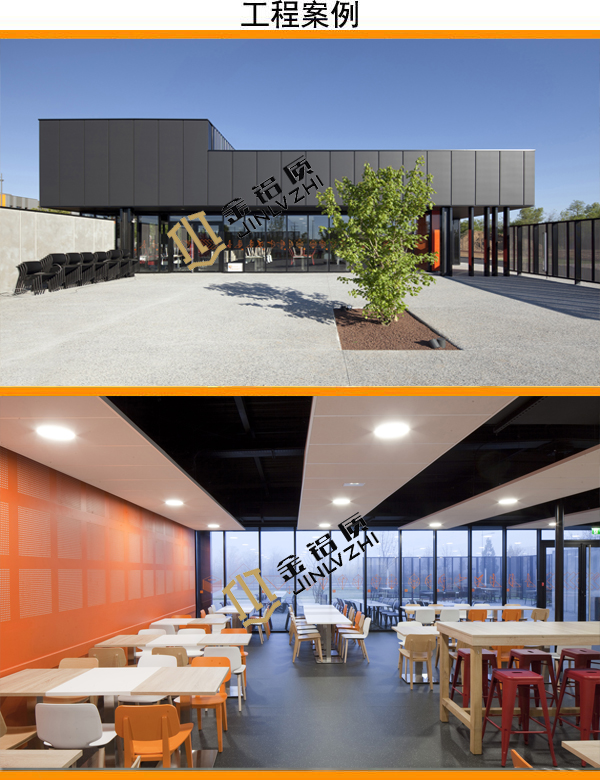 無(wú)論從哪個(gè)角度看,都是相當(dāng)時(shí)尚美觀的。如果你的餐廳也想裝成這樣的效果,可以選擇金鋁質(zhì)的鋁單板,可根據(jù)客戶的實(shí)際需求,加工定制成你所需要的形狀,圖案,銷售安裝一體化管理,讓你的餐廳也一樣煥然一新,讓生意變得更加興旺。